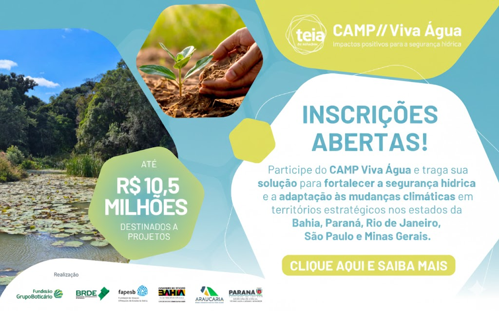 Estão abertas, até 13 de fevereiro, as inscrições para a “Teia de Soluções CAMP Viva Água – Impactos positivos para a segurança hídrica”. A iniciativa vai apoiar financeiramente soluções voltadas à segurança hídrica, promovendo conservação ambiental, adaptação climática, geração de renda e melhoria da qualidade de vida em territórios estratégicos nos estados da Bahia, Paraná, Rio de Janeiro, São Paulo e Minas Gerais.